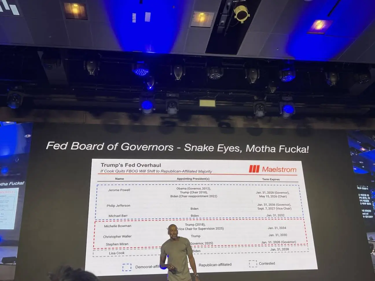 库克(Cook)是最近离开美联储的人。她在 8 月突然离职。有传言说她的丈夫在美联储会议期间进行了不道德的内幕交易,她是为了不被愤怒的特朗普逼迫辞职而自己辞职的。这就是史蒂文·莫兰得以进入的原因。现在特朗普有七分之三的票。第四个是丽莎·库克(Lisa Cook)。如果你一直在关注媒体,她是一个拜登最近任命的成员。有指控称她参与了抵押贷款欺诈,她谎报了自己的主要住所,以获得更低的房贷利率。她的案件已被移交给司法部,可能会进行刑事调查。目前,她非常固执,拒绝离开,拒绝辞职。但我认为到年底,她会得到她想要的某种政治保证,然后她就会退场。这样特朗普就有了四票,控制了理事会。