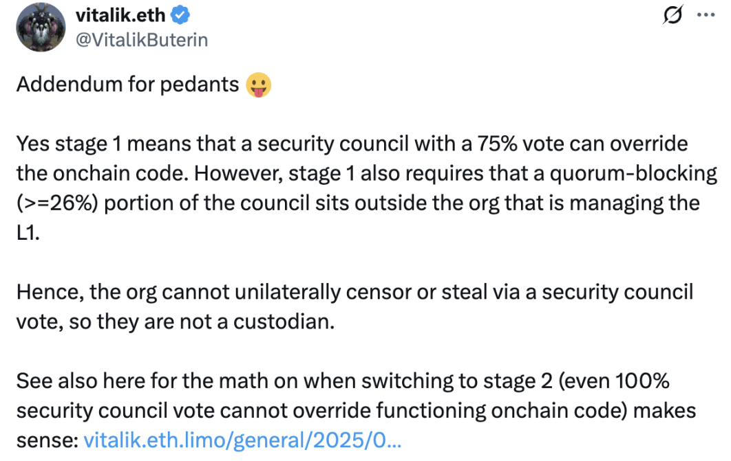 正在开发 Cardano L 2 Midgard 的 Anastasia Labs 创始人在 Vitalik 的补充评论下犀利地发表了「解读」:将「安全委员会」理解为「多重签名」;将「75% 投票」理解为「7 个私钥」;将「要求委员会中可以通过大于 26% 投票权否决提案的个人独立于管理 L 2 的组织之外」理解为「要求该组织使用空壳公司、朋友的公司、经过混淆的子公司或合作伙伴公司来持有多重签名所需的 3 个私钥」。