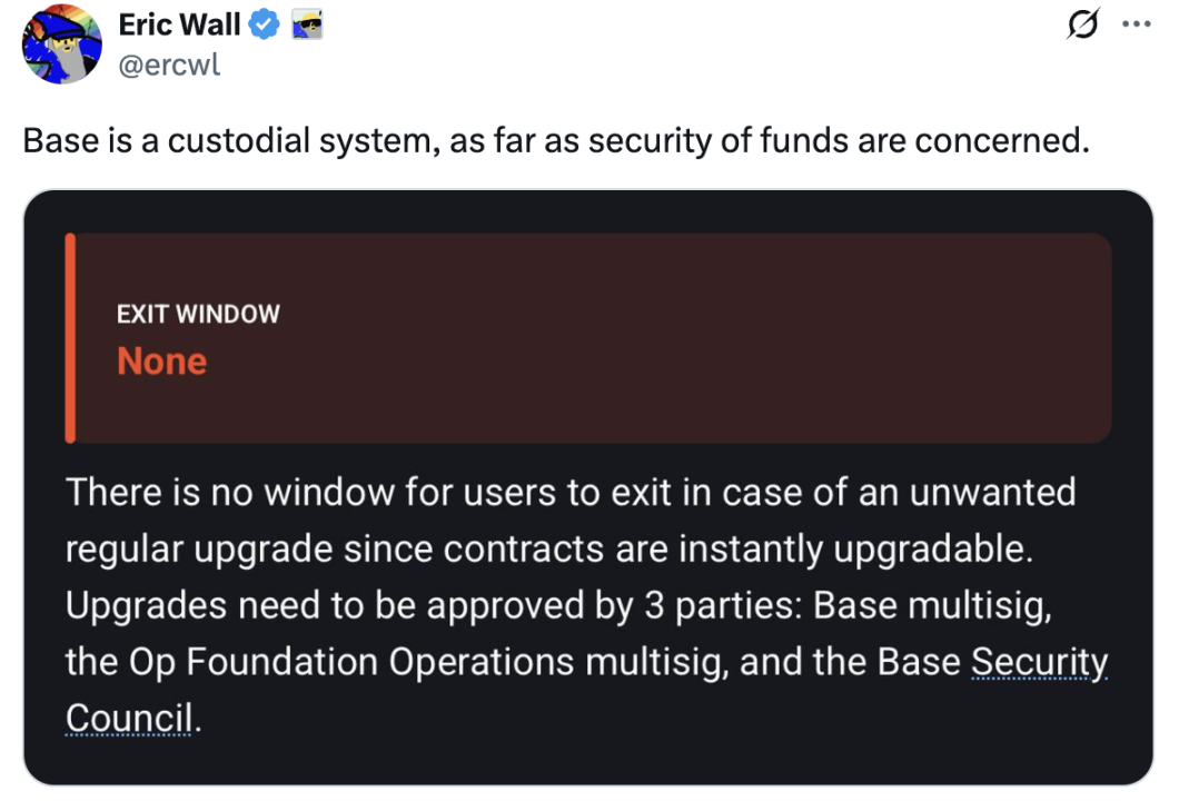 Vitalik 观点中认为 Base 中心化排序器是为了可扩展性和用户体验也引发了大量的争议。Taproot Wizards 联合创始人 Eric Wall 表示,就资金安全而言,Base 就是一个托管系统,并指出 Base 的合约仍然可以通过治理进行升级,这意味着运营商及其相关实体(通过安全委员会)保留了相当大的自由裁量权。在他看来,这使得 Base 在功能上更接近于托管系统,而不是完全信任最小化的以太坊扩展。Eric Wall 还在评论区表示,Vitalik 发表观点的措辞会让读者认为即使出现密钥泄漏也不会导致资金损失,如此表达很不负责任。