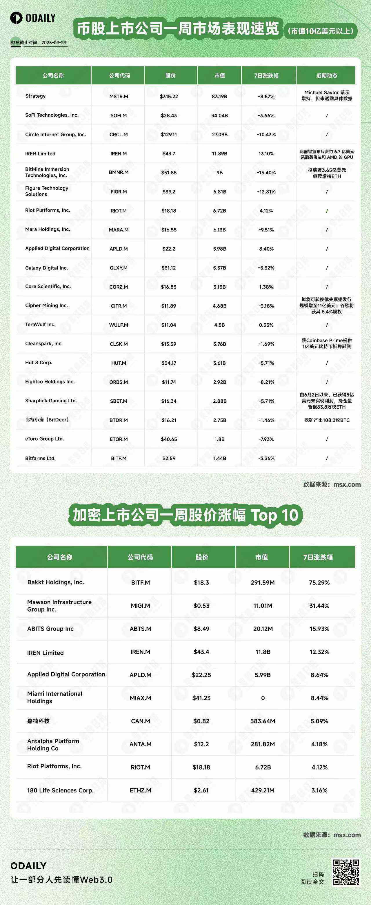 币股周报丨九紫新能董事会批准10亿美元用于加密投资;Bitmine拟募资3.65亿美元继续增持ETH(9月30日)