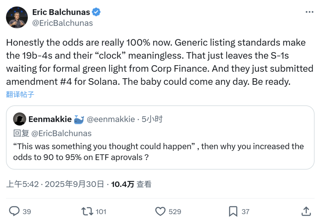 针对 SOL 的现货 ETF 情况,彭博 ETF 分析师 Eric Balchunas 表示,「说实话,SOL 现货 ETF 获批的成功率现在接近 100%。通用的上市标准让 19 b-4 文件及其时间节点变得毫无意义,现在就只剩下 S-1 表格相关事宜了。孩子随时都可能出生,做好准备吧。」
