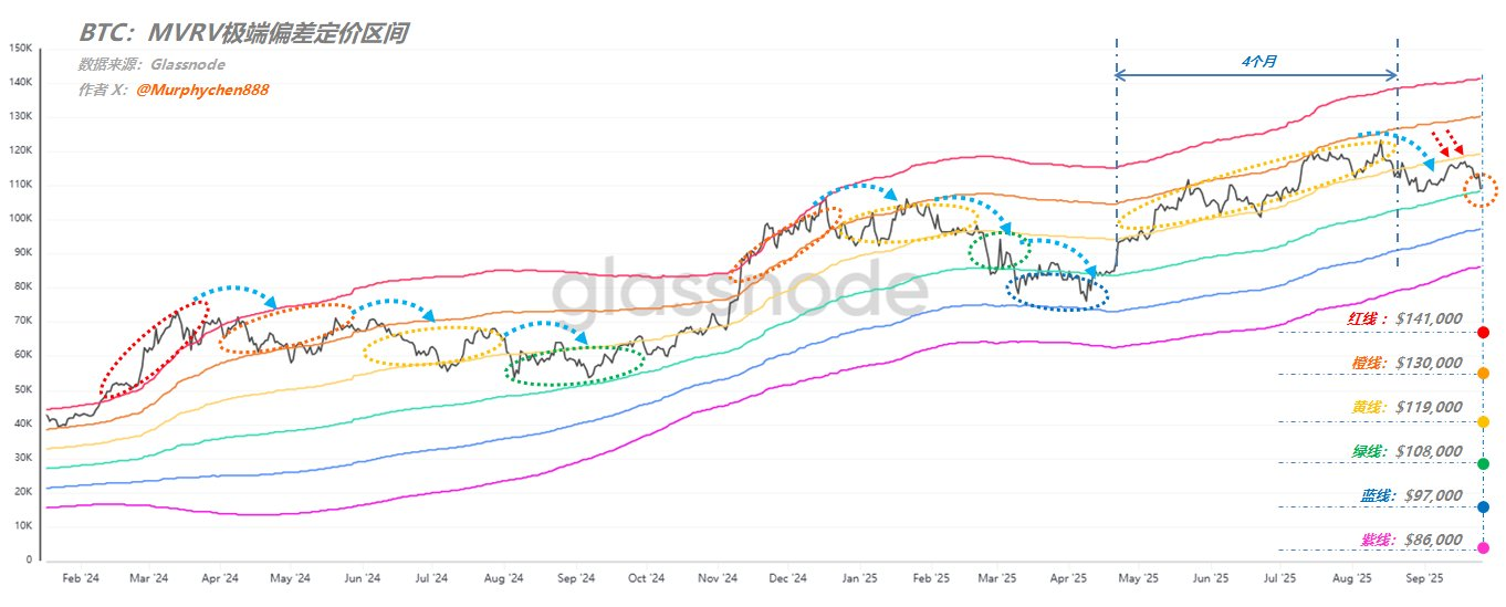 链上数据分析师 Murphy 表示,BTC 暂时在 MVRV 极限定价区间的绿线位置(约 10.8 万美元)获得支撑。BTC 走势出现趋势衰减,并进入了下一级定价通道,即价格在黄线和绿线之间运行。