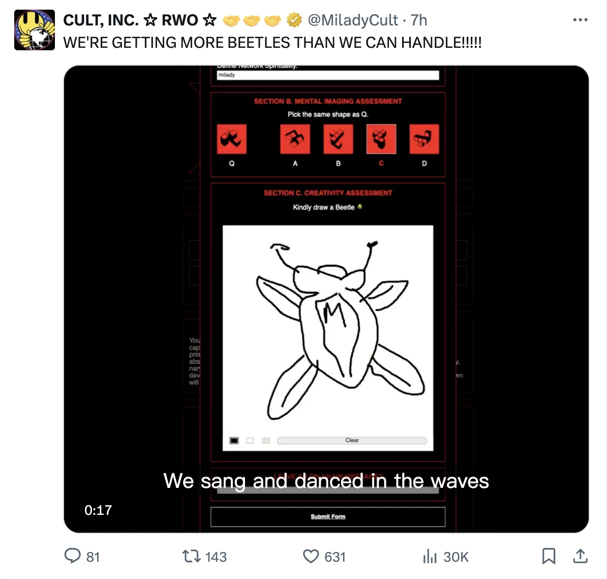 而根据 CULT 官方账号发布的信息 来看,参与 CULT 代币申领的用户画出来的甲壳虫也千奇百怪,颇具 Meme 属性,甚至说“极为抽象”也不为过。