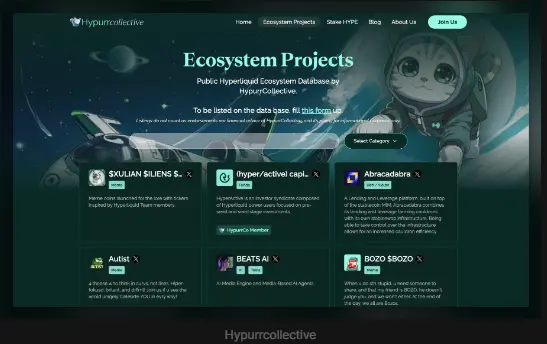Hypur 生态由社区成员自行发起,收录当前 Hype 生态项目,是新项目和用户进入生态的最重要入口,已组织了 HypurCo Member 的核心圈