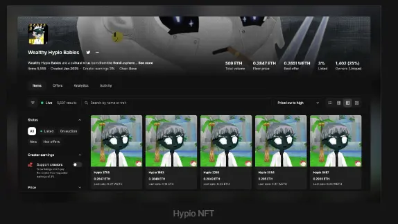 HyBio 是当前生态比较火的 NFT 合集,最早和 NFT 相关的推文是在 2025 年 ⅛,看起来是由 @8tejj8 所创作。团队于 ⅛ 公布参与方式,用户在 BASE 上铸造,有分白名单 ( Whitelist )、公售 ( Public Sale );总供应量 5500,155 个由团队持有,400 个贡献给国库