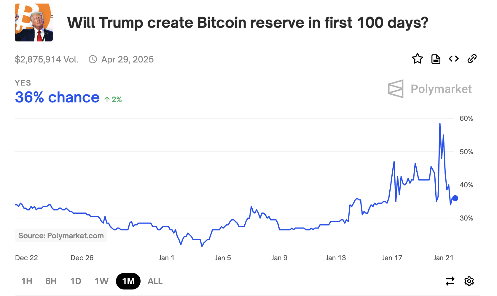 这一可能性在去年夏天由特朗普提出,并引发了加密货币市场的无穷想像,尤其是今天特朗普正式“登基”后的100天内市场一度预测此事会落地的可能性大于50%(Polymarket押注数据,发文时回落至36%)。
