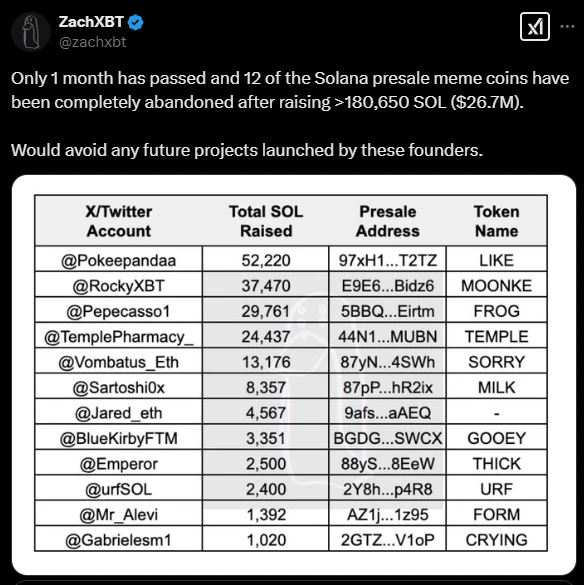 2024 年 4 月在 SOL 上就有 18 个 presale meme rug pulls,金额达到$ 26.7 M,到了 5 月是 41 个项目总共$ 102 M。