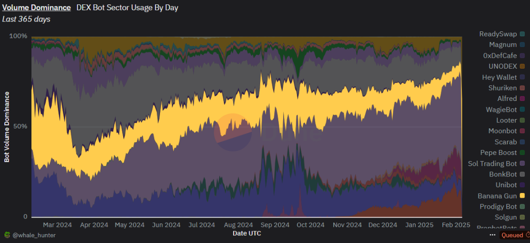 作为最先使用采取吸血鬼攻击的 Telegram 机器人之一,Banana Gun 在 2024 年 3 月一度单月捕获费用收入近 900 万美元,并一度占据着多链网络 TG 交易机器人赛道的超过 30% 的市场份额。不过,随着 TG 交易机器人赛道的竞争者大幅增多,链上 Meme 交易从 Ethereum 转向 Solana,以及诸如 BullX、Photon 和 GMGN 此类平台型 Meme 交易工具对 TG Bot 形成冲机之势,Banana Gun 市场份额逐渐滑落至 5%-10%。