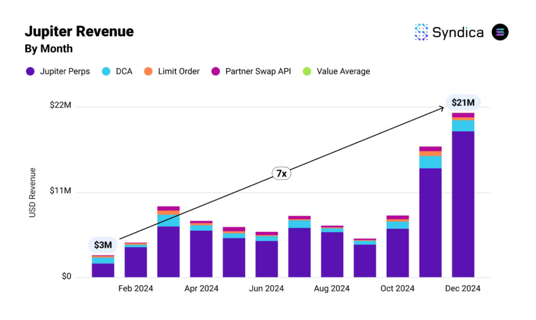 据 Syndica 数据,在 2024 年 12 月,Jupiter 协议收入达 2,100 万美元,创下历史新高,对比同年 1 月涨超 7 倍;在整个 2024 年中,Jupiter 协议收入达 1.02 亿美元。