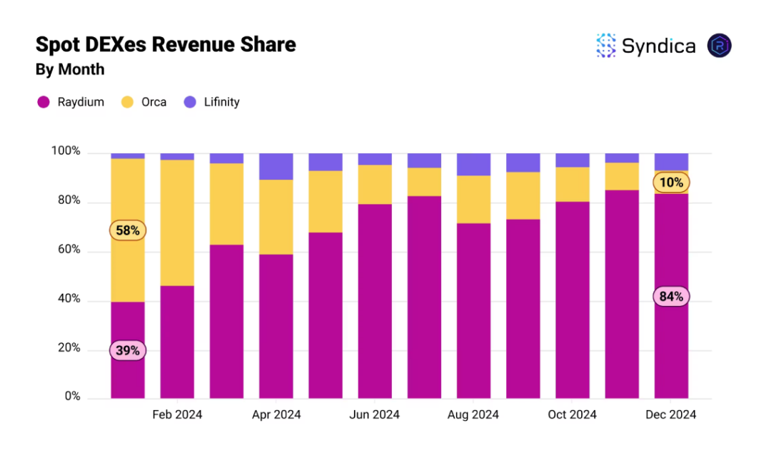 在 2024 年下半年,Solana 超越 Ethereum DEX 成为链上交易量最高的网络。Solana DEX 交易量在 2024 年全年超过 6,300 亿美元,其中 Raydium 从年初不到 40% 的市占率到 Q4 市场份额超过 80% 的绝对龙头。