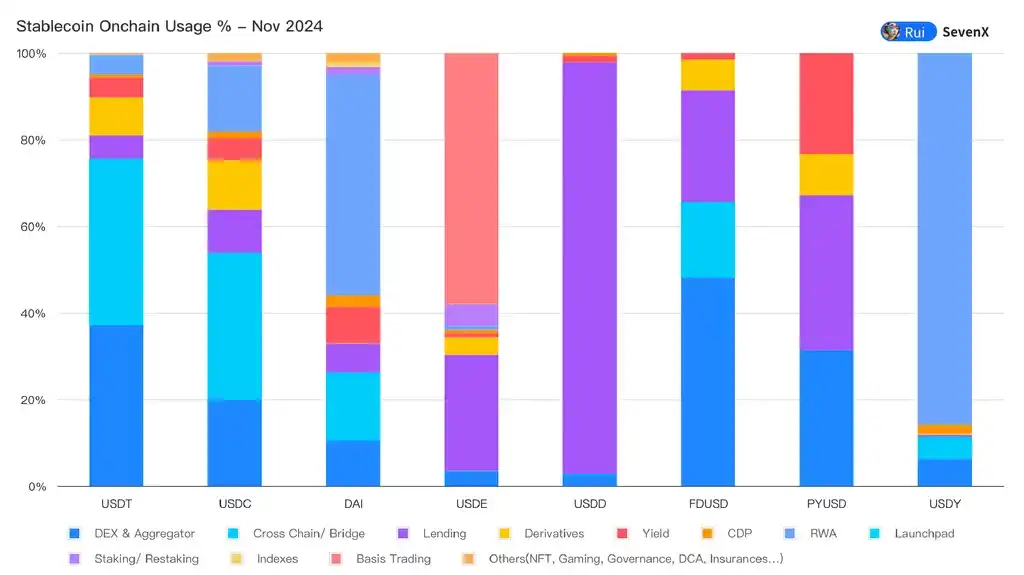 目前,只有 USDT、USDC 和少量 DAI 被用作交易对。其他稳定币,比如 Ethena 的 USDe,57% 被质押到它自己的协议中,完全是作为金融产品持有,用于赚取收益,远未成为交换媒介。