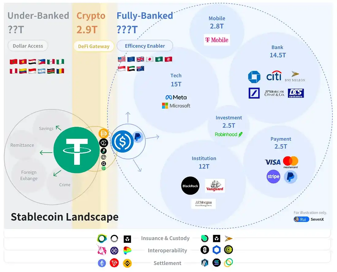 在 2.9 万亿美元的本地加密世界中,稳定币作为 DeFi 的入口,广泛用于交易、借贷、衍生品、收益农业和 RWA。加密原生稳定币通过流动性激励和 DeFi 整合进行竞争,在超过 400 万亿美元的完全银行化世界中,稳定币提高了金融效率,主要用于 B2B、P2P 和 B2C 支付。