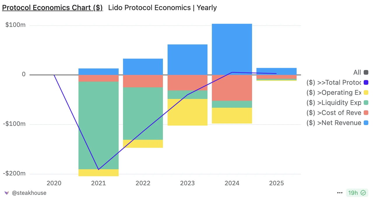 Lido 协议经济(图中蓝紫色折线为协议“净利润”) 来源: Dune