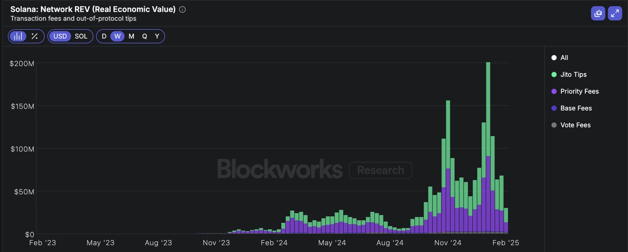 Solana 网络的 REV(即用户支付的全部费用) 来源: Blockworks