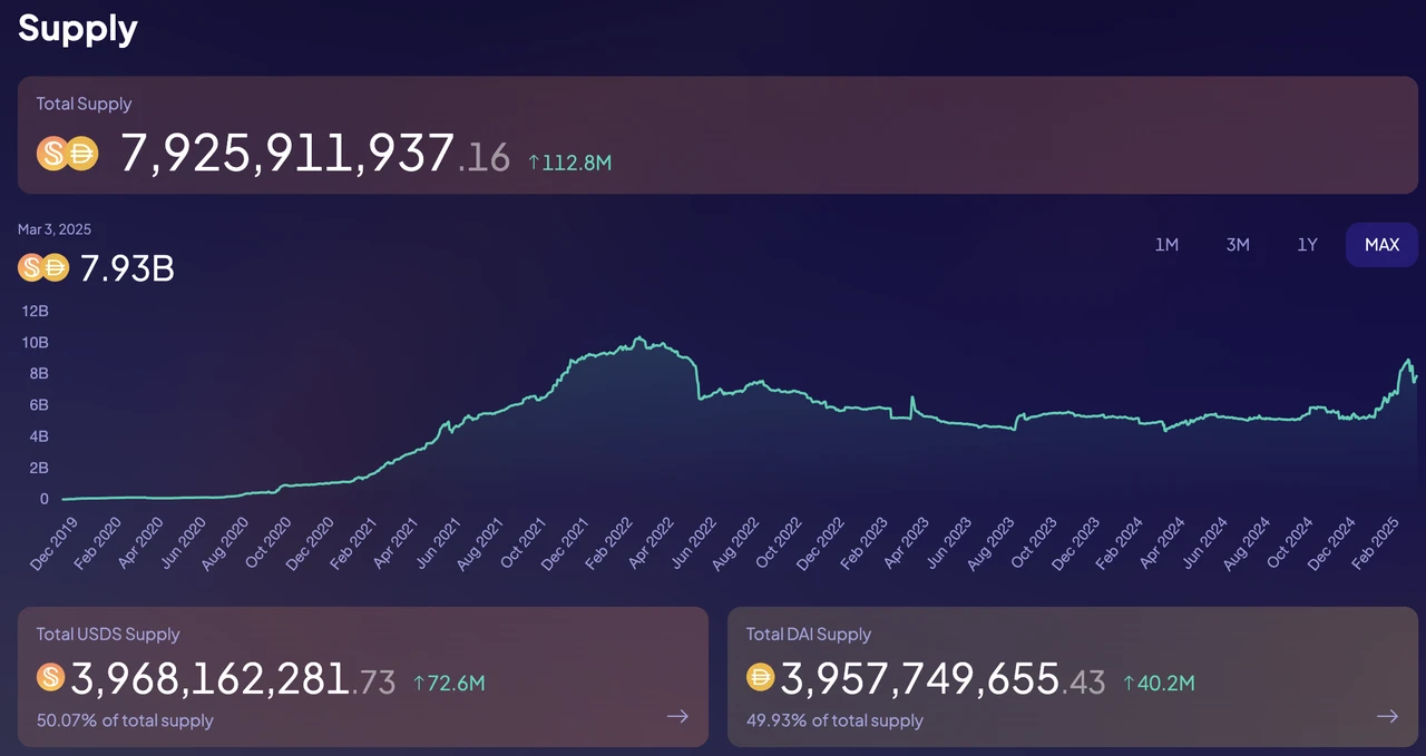 MakerDAO 是以太坊链上最早的 DeFi 协议,在 2015 年就已经创立,距今已有十年时间。凭借先发优势,其稳定币 DAI(含升级后的 USDS)长期都是市场上最大的去中心化稳定币。