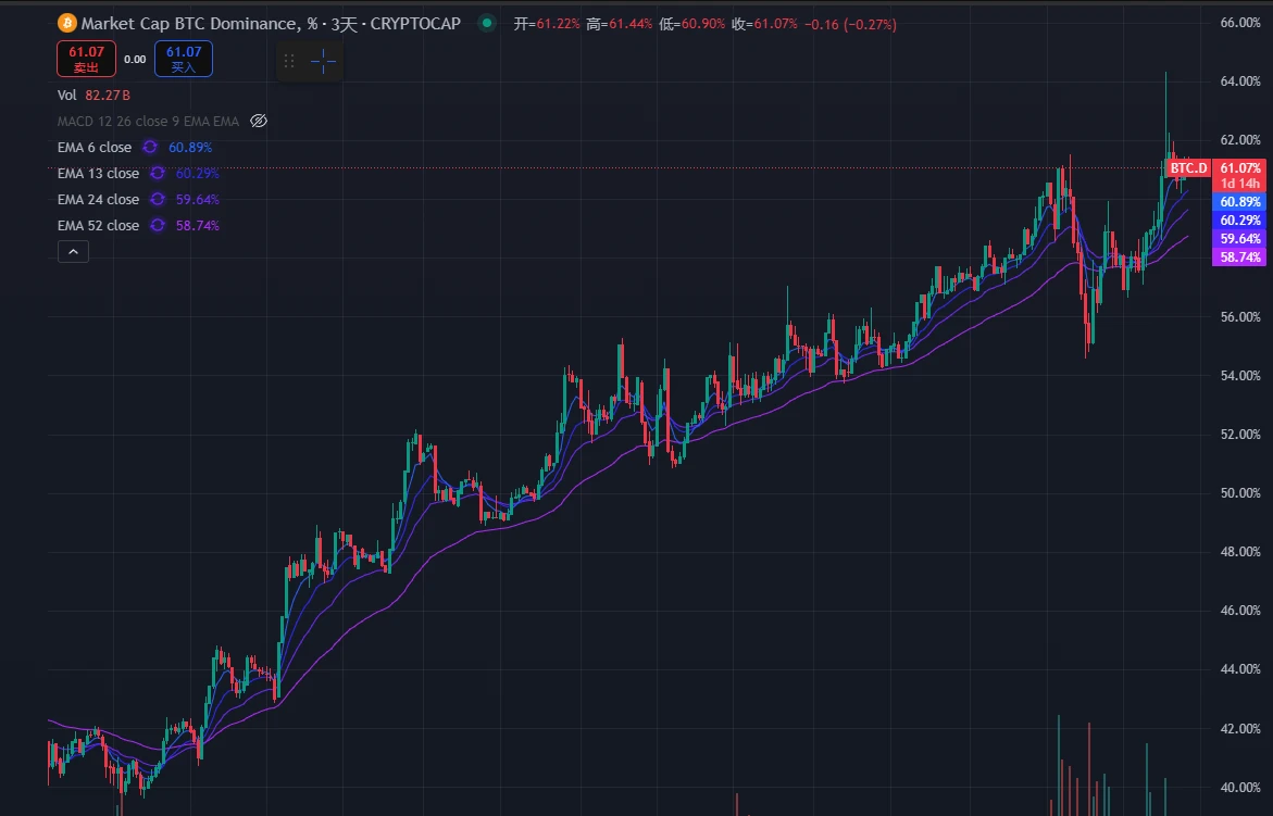 与过往几轮大牛市开启后各类山寨币价格表现活跃,导致 BTC 市占率快速下跌的历史规律不同,本轮牛市自从 2022 年 11 月市场见底以来,BTC 市占率从 38% 左右不断上行,目前稳稳站在 61% 以上,这还是在本轮周期山寨币数量快速扩容的背景之下,本轮山寨币价格之弱可见一斑。
