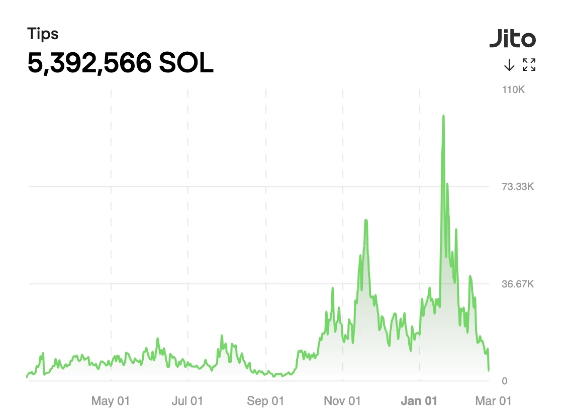 可以看出,Jito 的收入与 Solana 网络热度完全相关,其收入从 24 年 10 月开始比起之前有了数量级的提升,每周收入都超过 100 万美金,而且这部分收入有两个显著高点: 11 月 20 日和 1 月 20 日,当周 Jito 的协议收入分别高达 400 万美金和 540 万美金,对应的也是链上的两个大的投机热潮。不过近期 Solana 链上遇冷之后其收入也迅速下降。