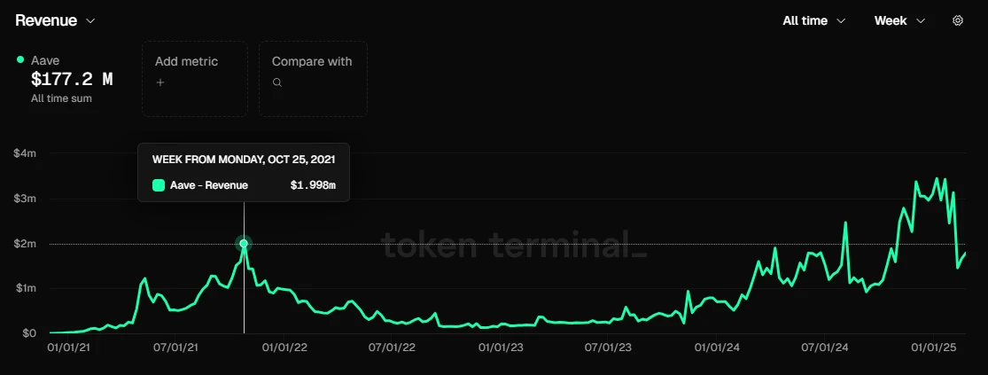 25 年 2 月同期,Aave 从产生的 6712 万美金 Fee 当中,创造了 857 万美金的协议收入,意味着其大致的费用留存率为 857/6712 = 12.8% (只是大致计算)。
