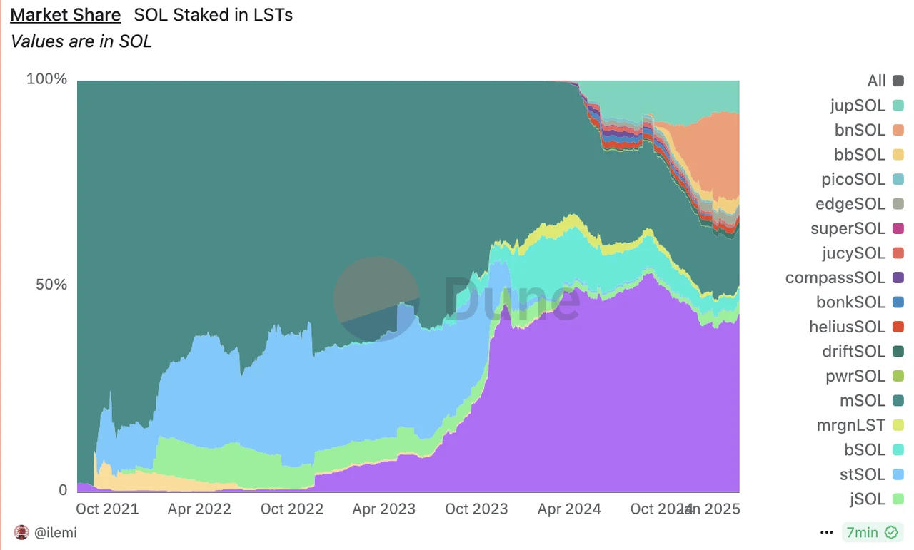 2023 年底开始,Solana 的流动性质押市场迎来了更多的玩家,Blazestake、Jupiter 等越来越多的玩家相继加入战场,但 Jito 的市场份额未受影响。不过,在 2024 年 10 月开始,交易所的 SOL 流动性质押产品(主要是 Binance 的 bnSOL,也包括 Bybit 的 bbSOL)使得 Jito 的市场份额有所下降,这主要是由于中心化交易所具备托管资产的天然优势,他们将 SOL 理财产品从原本的原生质押转为流动性质押,给用户提供了更优的体验,因而其份额迅速上升。我们从上图 1 也可以看到,来自 bnSOL 和 bbSOL 的增量部分相对“独立”,并不是侵占了某些 LST 协议的份额。