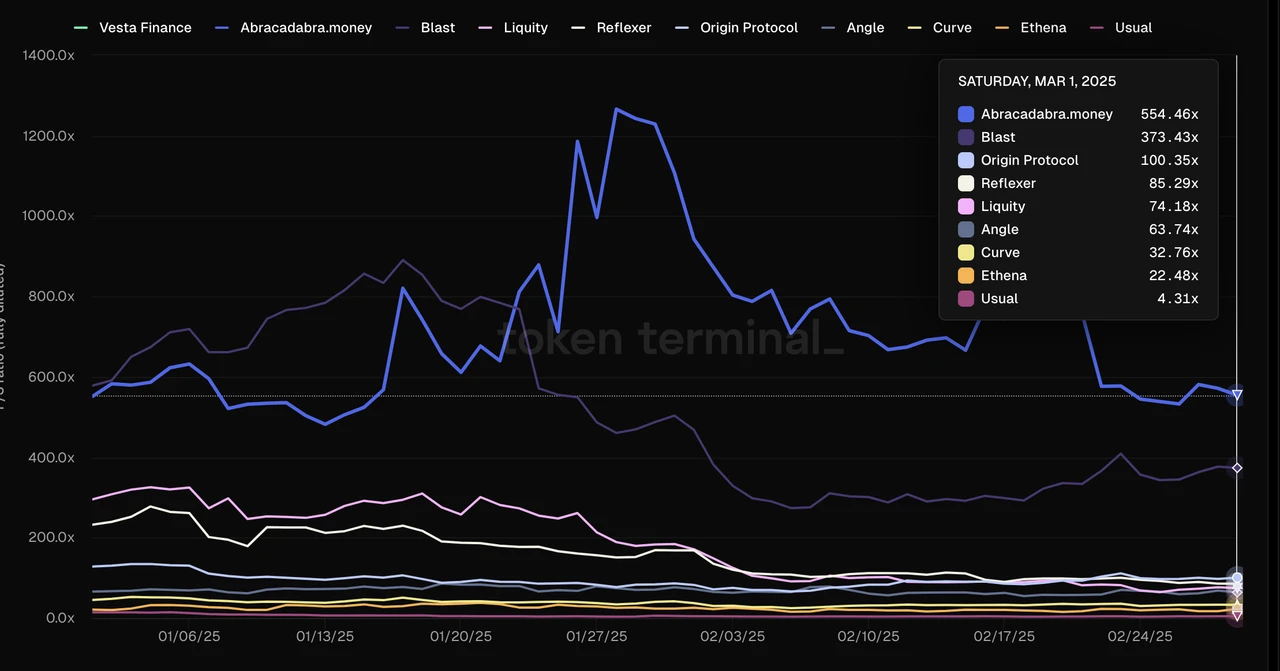 除 MakerDAO 之外稳定币项目的 PS 来源:Tokenterminal