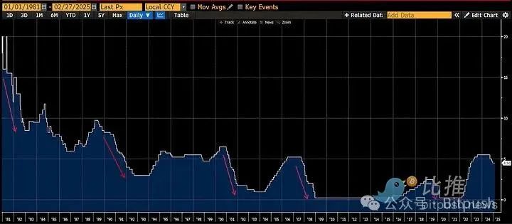 这是一张联邦基金利率下限的图表。每个红色箭头都代表着与衰退同时发生的宽松周期的开始。正如你所看到的,非常清楚的是,美联储至少会在衰退期间降息。