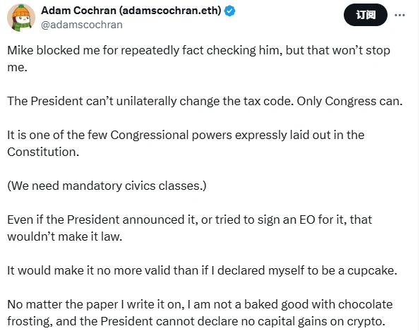 而对于 Mike Alfred 所传“特朗普准备宣布加密货币零税率”一事,Cinneamhain Ventures 合伙人 Adam Cochran 更是直接开喷:“Mike 因为我反复核实他的事实而拉黑了我,但这并不能阻止我。总统不能单方面修改税法。只有国会才可以。这是宪法明确规定的少数国会权力之一。即使总统宣布该决定,或试图为其签署行政令,也不会使其成为法律。这并不比我宣称自己是一块纸杯蛋糕更有效。”