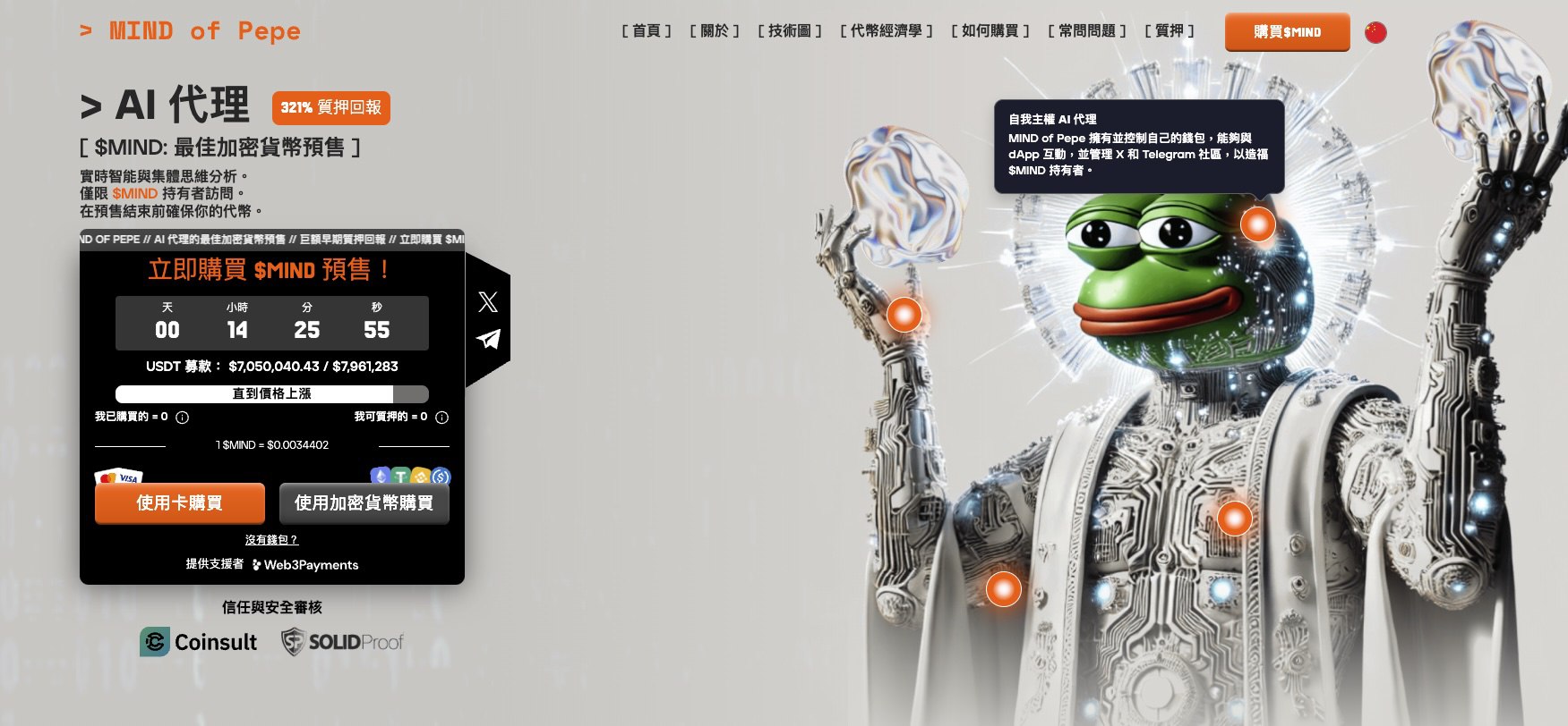 与Bybit机器人竞赛不同,MIND of Pepe($MIND)则从更前沿人工智慧技术切入市场。该项目以自主AI代理为核心,实现全自动加密货币市场分析与交易策略生成。这一AI代理不仅能够自行运行,还具备蜂群思维技术与深度学习能力,能够即时分析市场数据,帮助投资者做出最优决策。