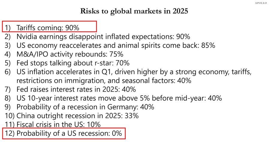 在2024年12月,市场情绪如此看涨,以至于阿波罗(Apollo)发布了2025年的风险评估,预测美国经济衰退的可能性为0%。