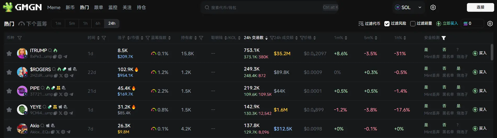 过去 24h Solana 热门代币前五依次为:ITRUMP、$ROGERS、 PIPE、YEYE、Akio