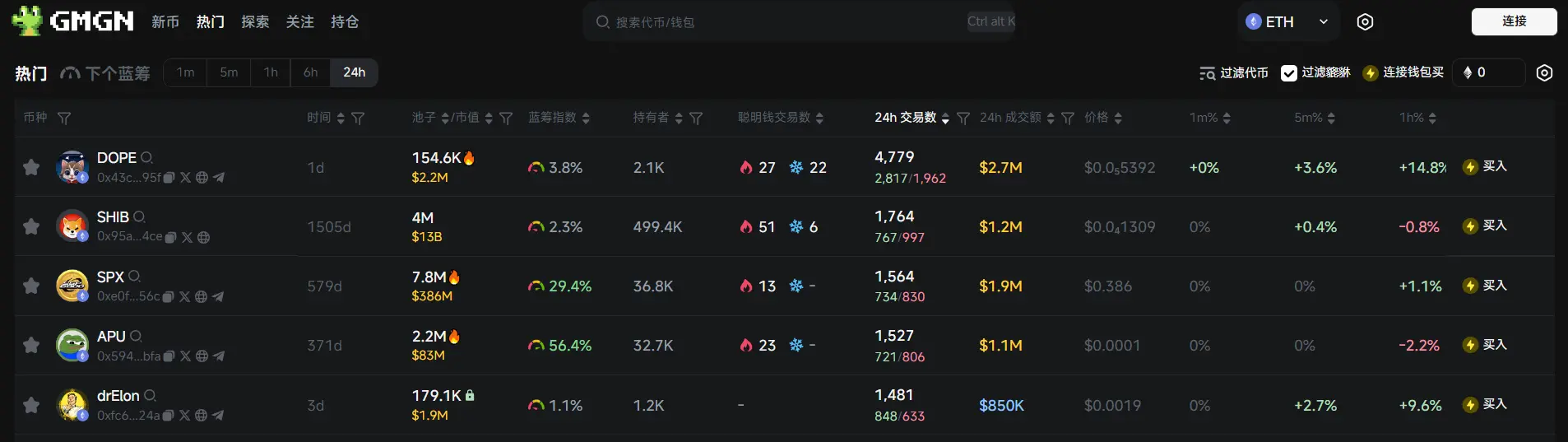 过去 24h 以太坊热门代币前五依次为:DOPE、SHIB、SPX、APU、 drElon