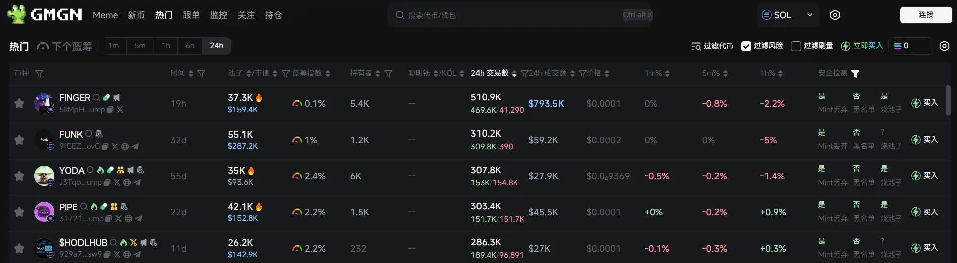 过去 24h Solana 热门代币前五依次为:FINGER、FUNK、YODA、 PIPE、$HODLHUB