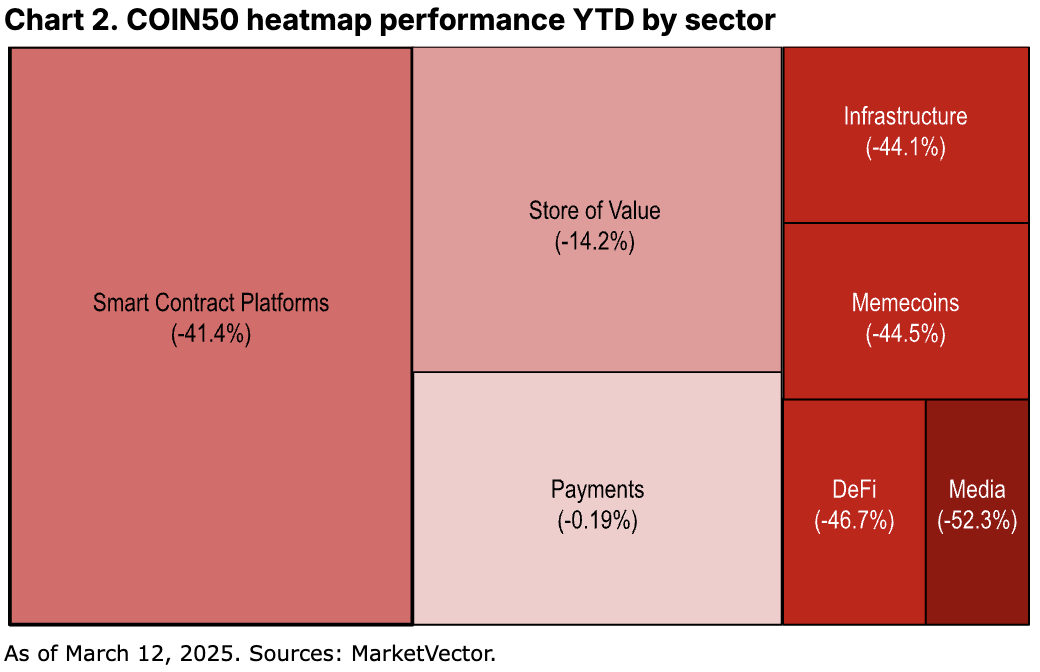 此轮抛售潮导致我们的Coinbase 50(COIN50)指数从年初至今累计下跌25.5%,加密市场总市值蒸发5320亿美元。有趣的是,除媒体与娱乐板块外,指数内各细分领域受市场波动冲击的幅度差异并不显著。DeFi、Memecoin及基础设施板块均出现类似程度的剧烈回调。这一现象凸显当前全市场广泛的避险情绪,并没有出现对不同项目的基本面与营收能力进行选择性考量的情况。