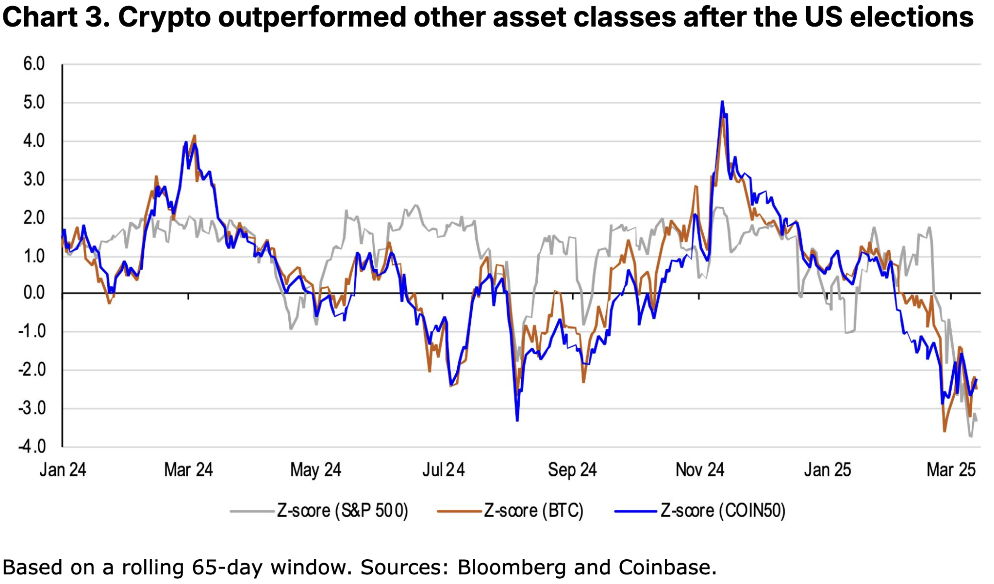 另外,我们并不认为加密货币近几周的疲软表现与当今宏观紧缩条件存在异常背离。相反,真正的背离体现在2024年11月(美国大选)至2025年1月20日(总统就职)期间加密资产与传统风险资产的表现差异。尽管2024年下半年起流动性环境已逐步趋紧,但此期间以COIN50指数为代表的市场价格却累计攀升逾67%(详见图表3)。