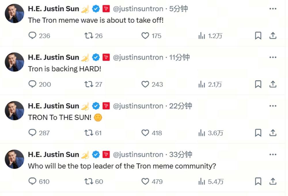 3月19日,孙宇晨一连数条推文为TRON Meme Season站台,并宣称“绝不赚Meme一分钱,任何Meme亏损全部自己承担,所得全部捐献”。这一承诺迅速引发了市场的广泛关注,波场生态内的多个代币也随之迎来暴涨。