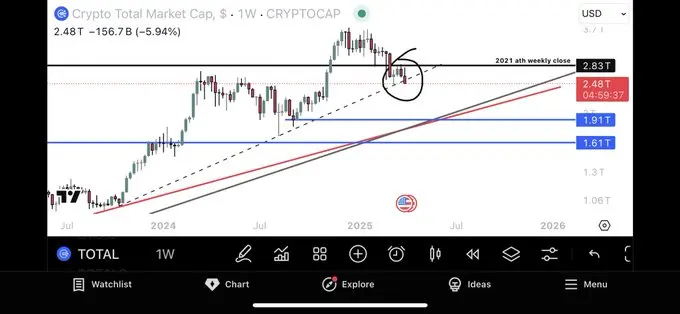 当然,也有可能会进一步下探到 1.61 万亿美元的位置(可能只是插针,但说实话也不确定)。如果真的走到这个位置,那市场的痛苦程度将难以想象,请务必提前做好准备……顺带一提,如果这种情况发生,可能的底部时间点就在 4 月。