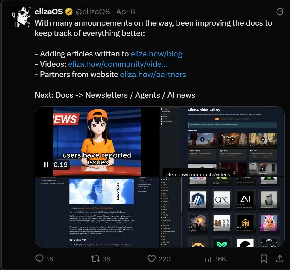 @elizaOS 专注于通过简化和整理所有文档,打造完整的开发指南,并通过 YouTube 视频进行详细介绍,来实现用户引导。