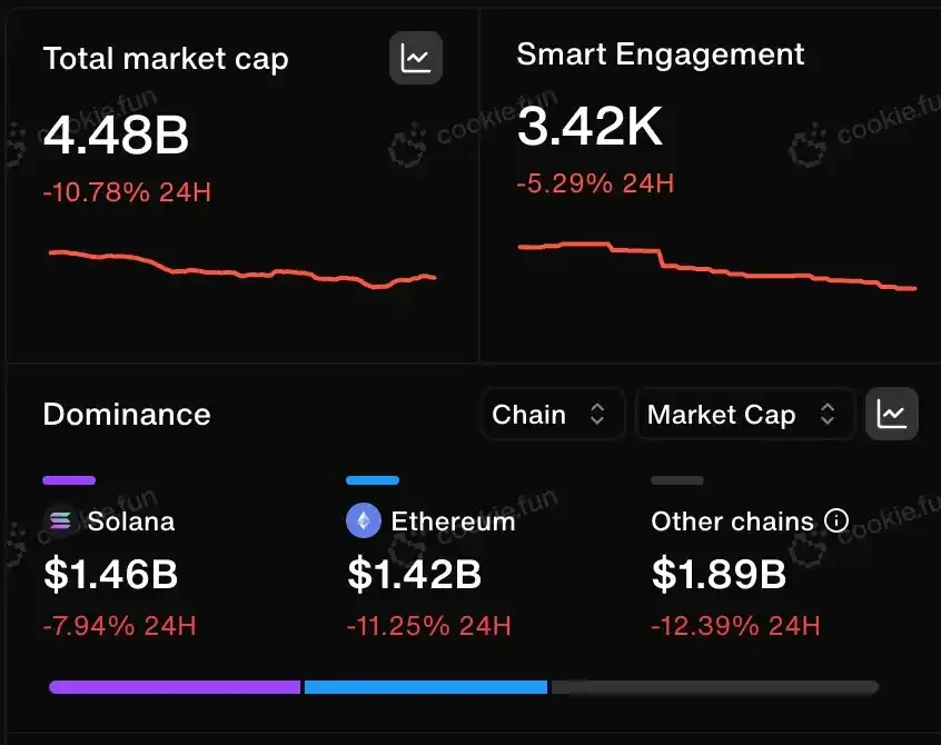 AI 板块的总市值如今已跌破 50 亿美元,在过去 24 小时内下跌了 10% 。考虑到$BTC 一度触及 74, 000 美元高点,日跌幅为 7% ,这其实已经算是相对抗跌的了。相比之下,$ETH 跌幅超过 16% ,最低跌至 1410 美元,这是自 2018 年以来未曾见过的价格。