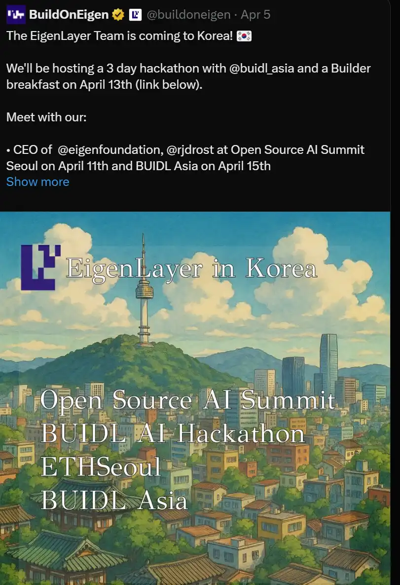 @eigenlayer 在 AI Open Summit 上发言,并且将在韩国举办黑客马拉松:
