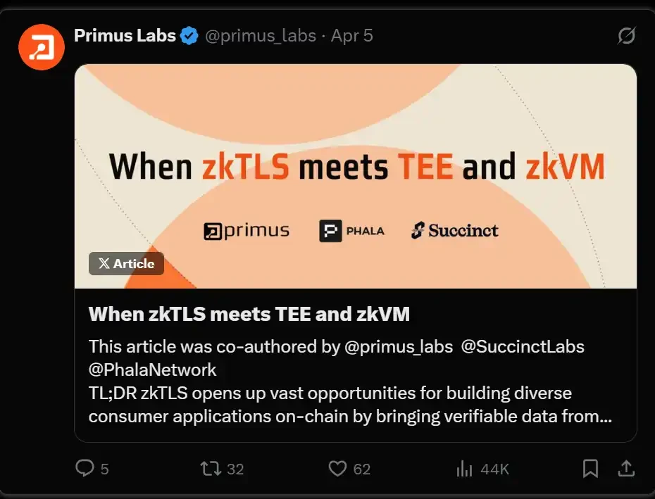 当 zkTLS 遇上 TEE、zkVM,由 @SuccinctLabs @PhalaNetwork @primus_labs 提供: