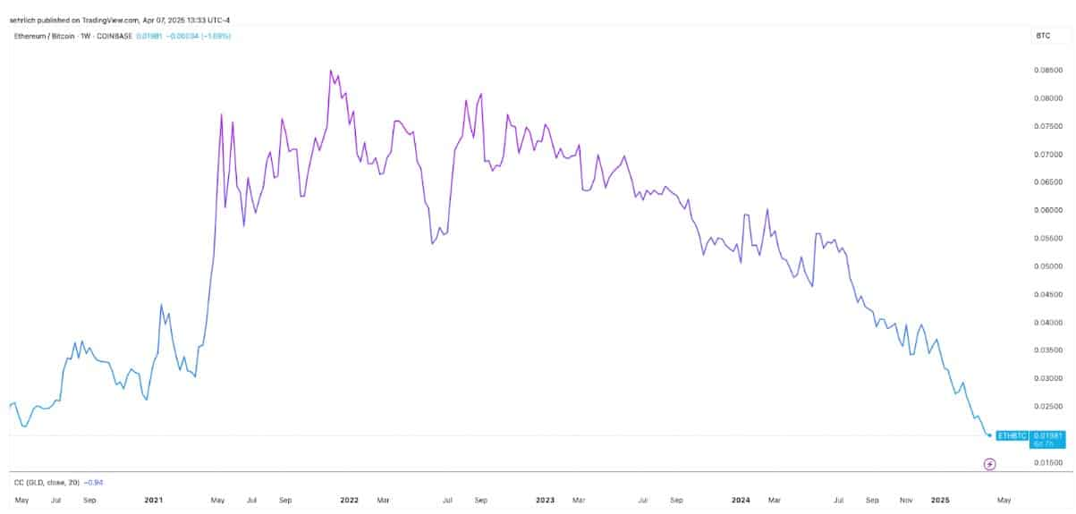 以太坊同样被认为是值得关注的资产,尽管它近年来在价格表现上远远落后于比特币,且目前与比特币的比值处于自疫情初期以来的最低点。