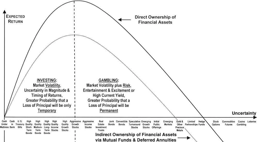 Meme 币市场的主要参与者是散户投资者。著名的“道琼斯指数投资与赌博对比图”清晰展现了预期回报与不确定性之间的连续谱,大多数严肃的金融从业者都在强调,Web3.0 资产需要远离“彩票思维”。
