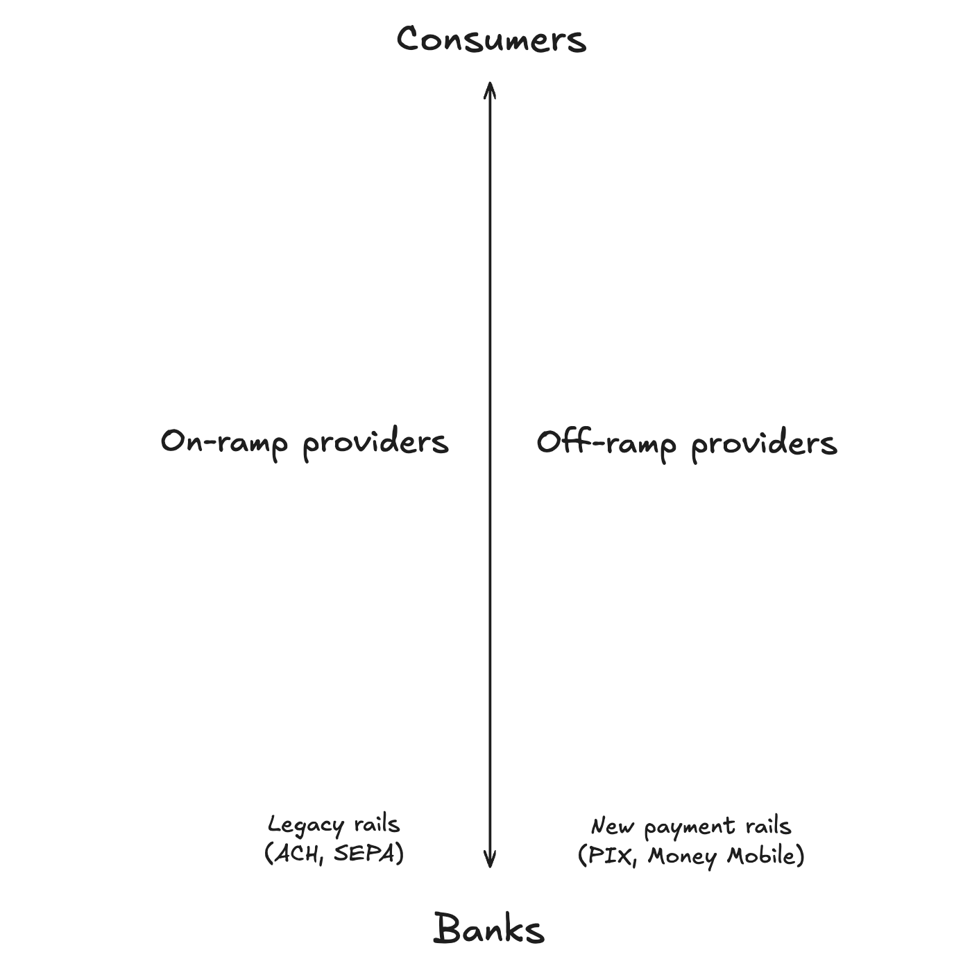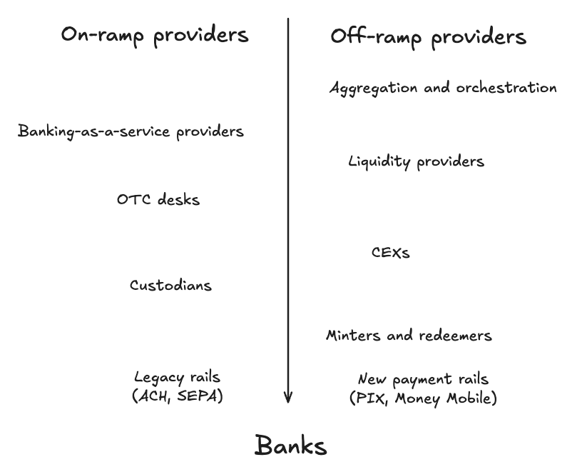 在这一层之下,是帮助稳定币和法币尽可能无缝流动的公司和服务。以下是三个关键层,通常会被聚合和协调: