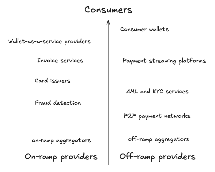 最后,入金/出金聚合器位于服务消费者层的底部。它们将多个入金/出金服务提供商整合到一个易于集成的 API 中,使钱包提供商能够根据速度、成本和区域服务的组合,自动选择最佳方案。