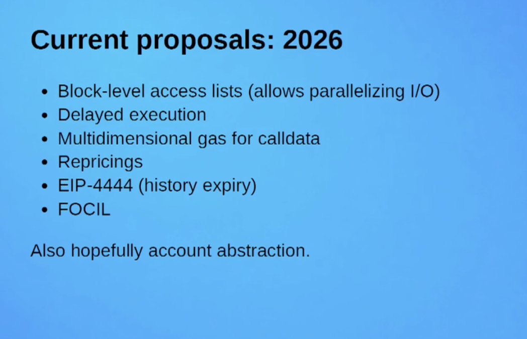 Vitalik 表示,从短期规划来看,预计在 2026 年,一系列提案将陆续落地实施。通过这些提案,以太坊有望大幅提高 Gas 限制,并且在确保节点去中心化不受损害的前提下,安全地达成这一目标。针对 2026 年的规划,目前已提出的提案 / 提议包括: