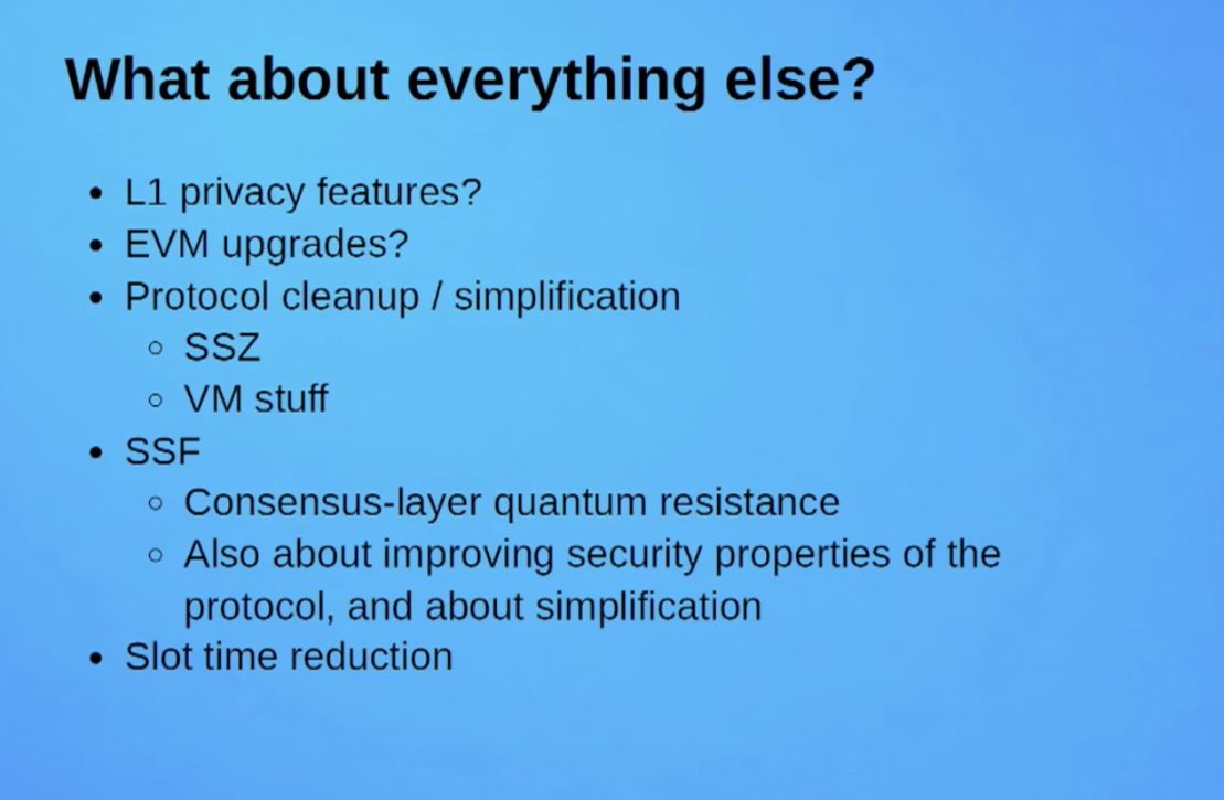 在其他方面,以太坊同样在 L1 隐私功能强化、EVM 升级、协议清理 / 简化、共识层量子抗性提升、协议安全属性与简化性优化,以及 Slot 时间缩减等领域积极探索。