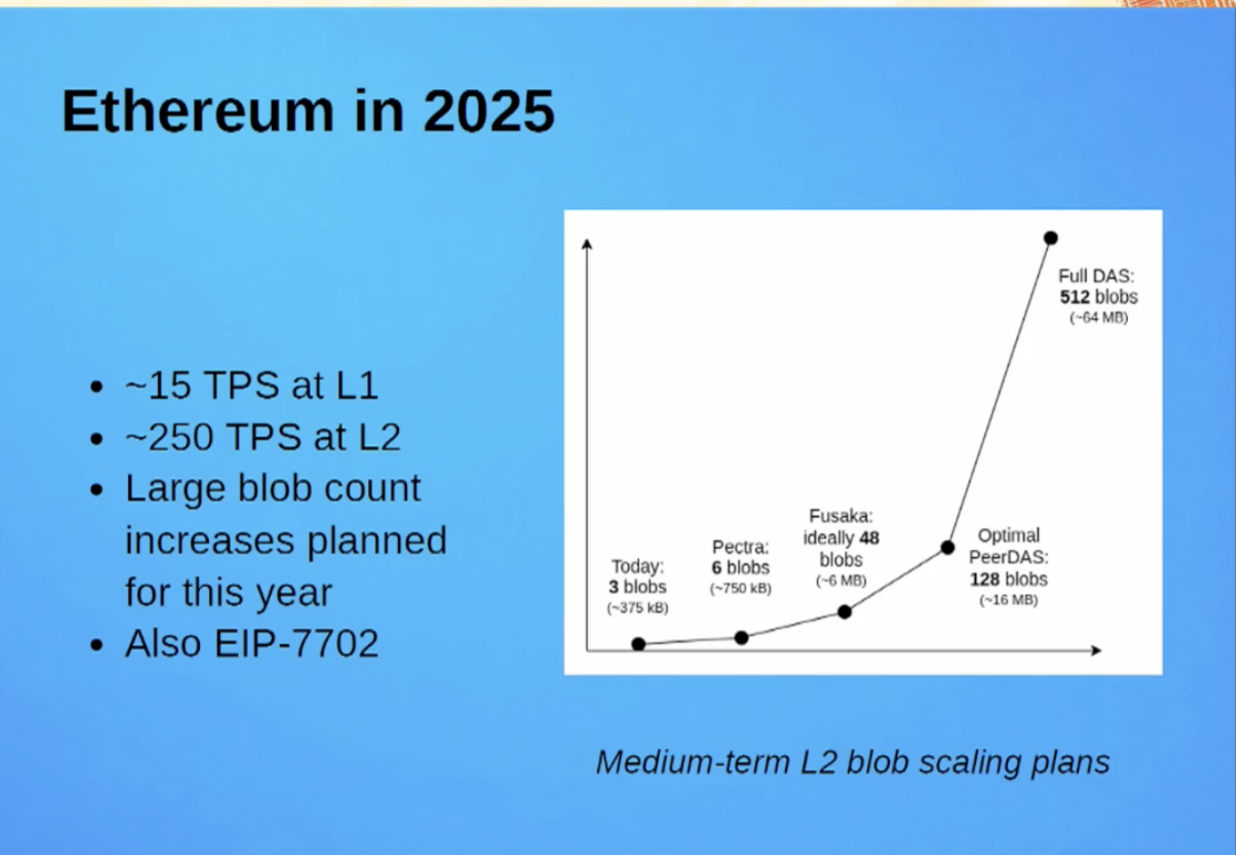 即将到来的 Pectra 升级将把 Blob 容量从 3 个增加至 6 个。当前, 3 个 Blob 约为 375 kb,每 12 秒产生 375 kb 数据,即每秒约 20 kb,对应 TPS 约为 250 ;若 Blob 容量增至 6 个,TPS 有望提升至 500 。不过,Blob 容量的扩展在很大程度上依赖于今年三季度或四季度将实现的 Fusaka 升级。在理想情况下,Fusaka 升级可将 Blob 容量提升至 48 ;若最终完整实现 DAS,Blob 容可高达 512 ,届时以太坊 L2 的 TPS 甚至可能提升至数万次。