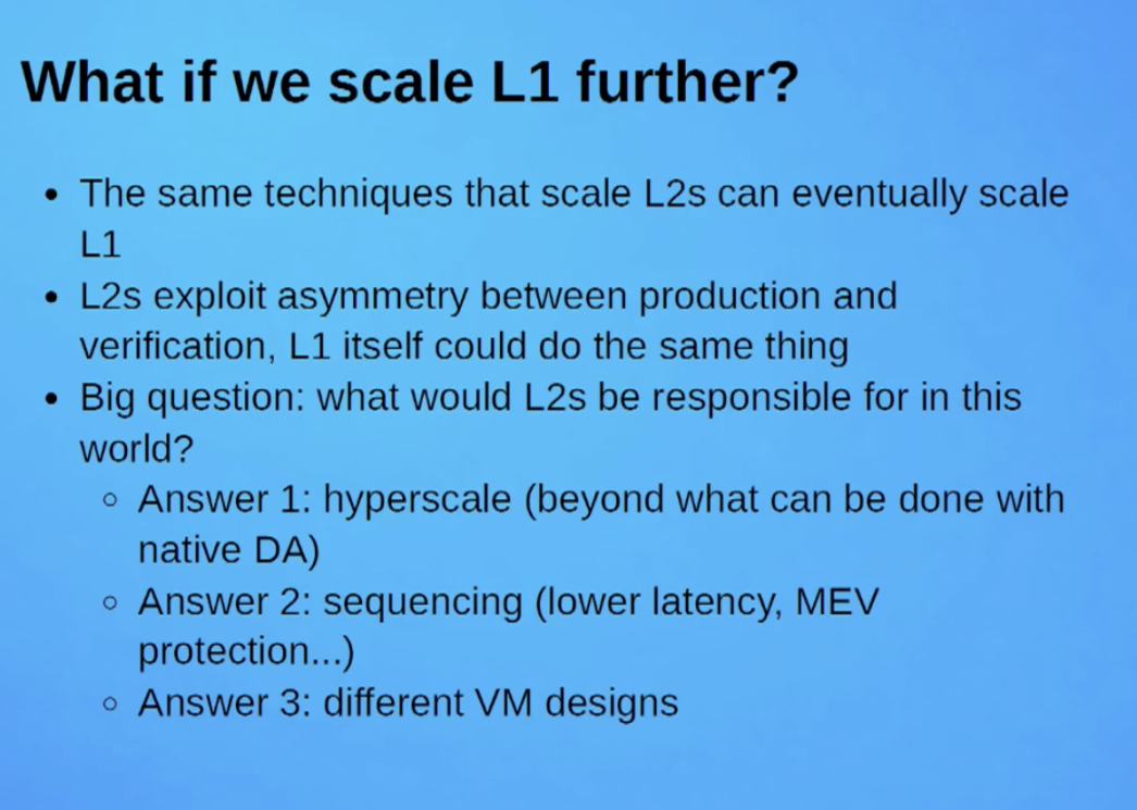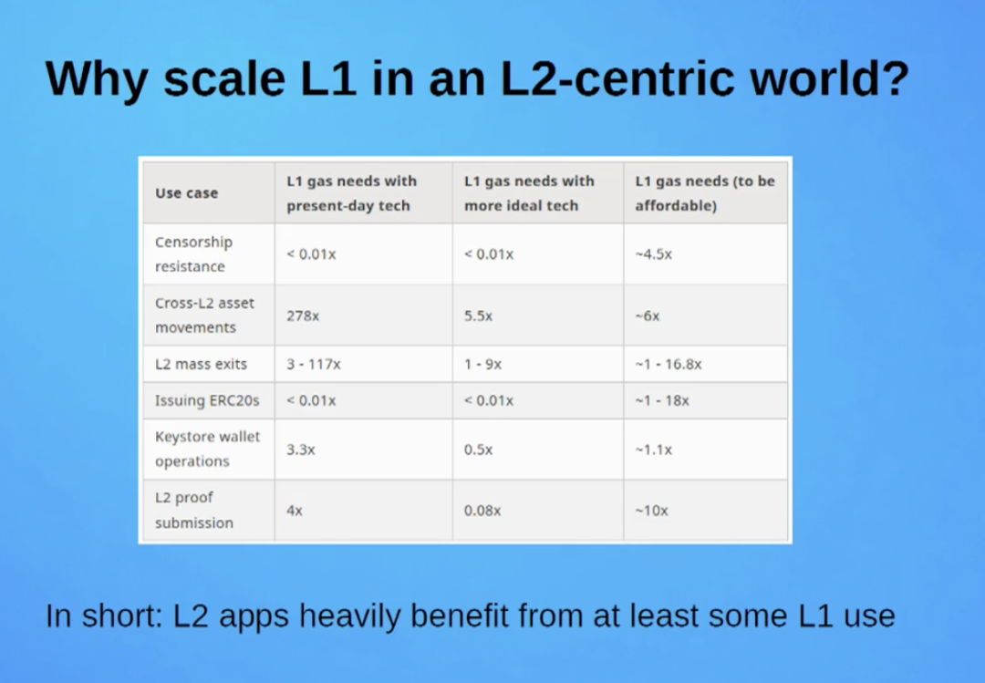当然,以太坊 L1 的扩展同样不可或缺。即便未来用户普遍采用 L2,L1 仍需承担诸多关键功能。尤其是当 L2 出现故障时,L1 需要提供相应的补救措施,或支持用户进行大规模退出操作。
