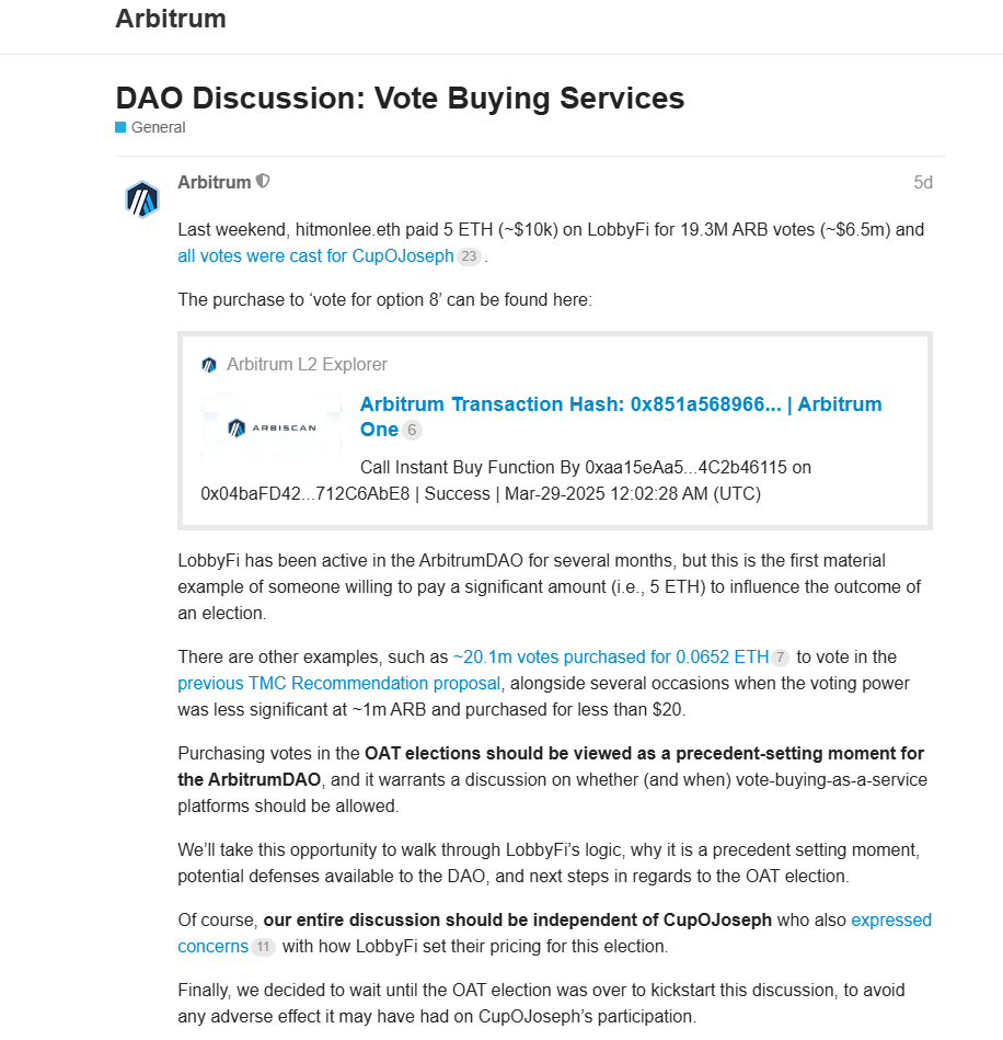 在 Arbitrum OAT 选举案例中,hitmonlee.eth 正是利用了 5 ETH 的“即时购买”选项。LobbyFi 声称其运作是透明的,会披露可供购买的提案投票权及其价格,并给予市场反应时间。然而,这种机制的本质是将治理权力商品化,允许短期资本以远低于直接购买等量代币的成本,来获取巨大的治理影响力。