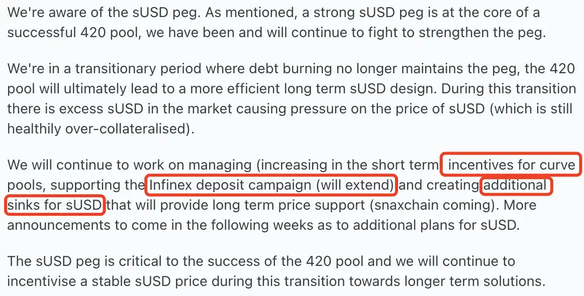 对于 SNX 持有者和 sUSD 用户来说,团队也为过渡期制定了详细预案。Synthetix 官方通过 Discord 进一步补充了应对措施,包括短期内加强 Curve 资金池的激励、延长 Infinex 存款活动支持期限,以及构建 sUSD 的长期价格支撑体系。