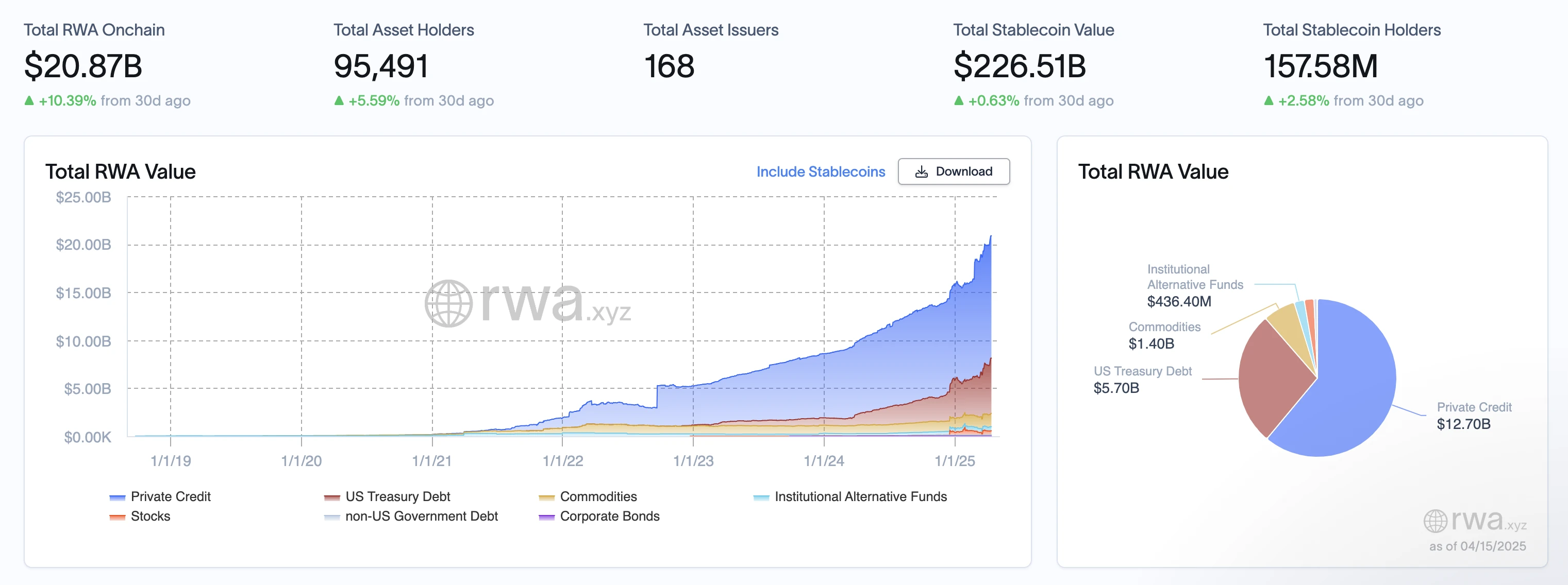 根据 RWA.xyz 数据,截至 2025 年 4 月 14 日,RWA 链上总价值达到 208.7 亿美元,较 30 天前增长 10.39% 。链上资产持有者总数为 95, 491 人,较 30 天前增加 5.59% ,资产发行数量为 168 个。稳定币总价值为 226.51 亿美元,较 30 天前增长 0.63% ,而稳定币持有者数量为 157.58 万人,较 30 天前上升 2.58% 。